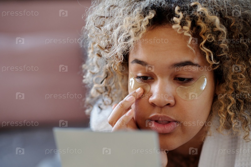 Близкий план молодой женщины, которая наносит гидратацию под повязки для глаз