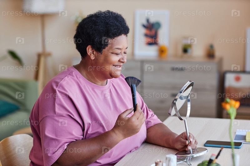 Счастливая зрелая женщина в повседневной одежде смотрит в зеркало во время нанесения порошка