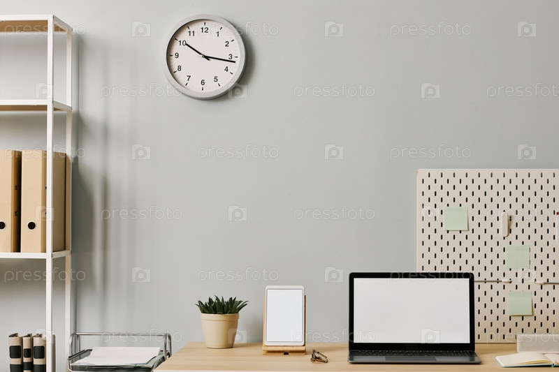 Минимальная конфигурация офиса с макетом экрана ноутбука на рабочем столе пастельно-синей стеной