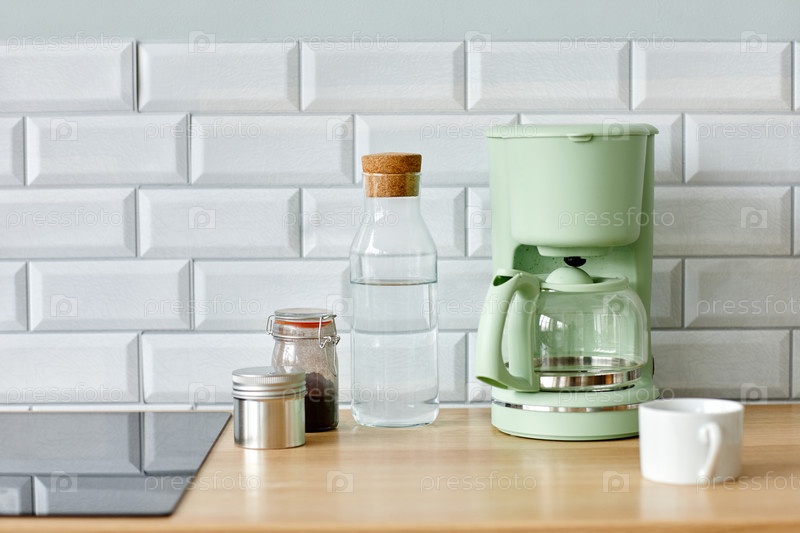 Кофейный котел на кухонном столе Mint Coffee Pot on Kitchen Table