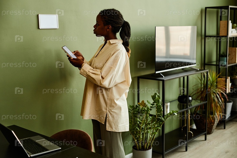 Чернокожая женщина, использующая Smart Home System Modern