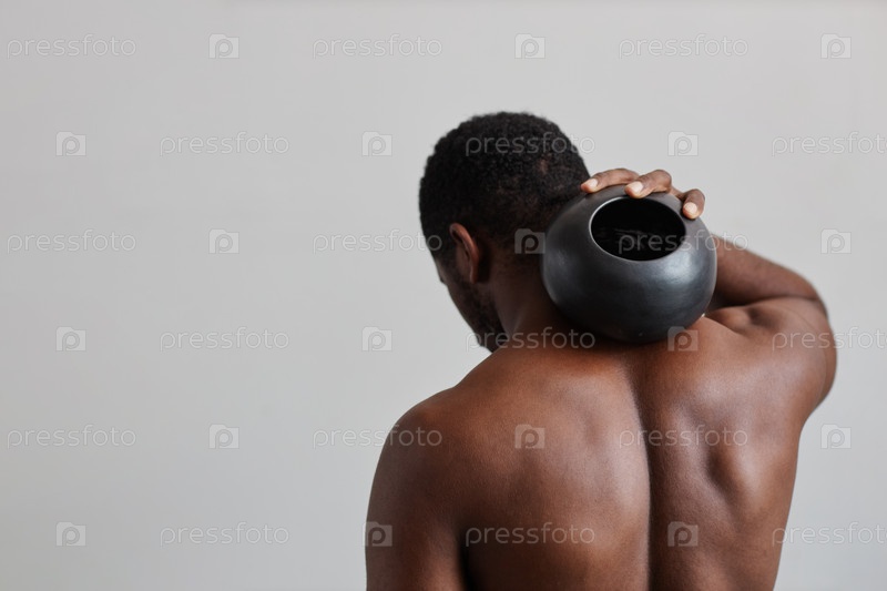 Без рубашки чернокожий мужчина держит круглую вазу на спине