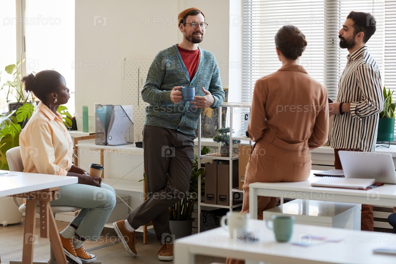 Группа из четырех молодых межкультурных менеджеров обсуждают последние новости во время перерыва