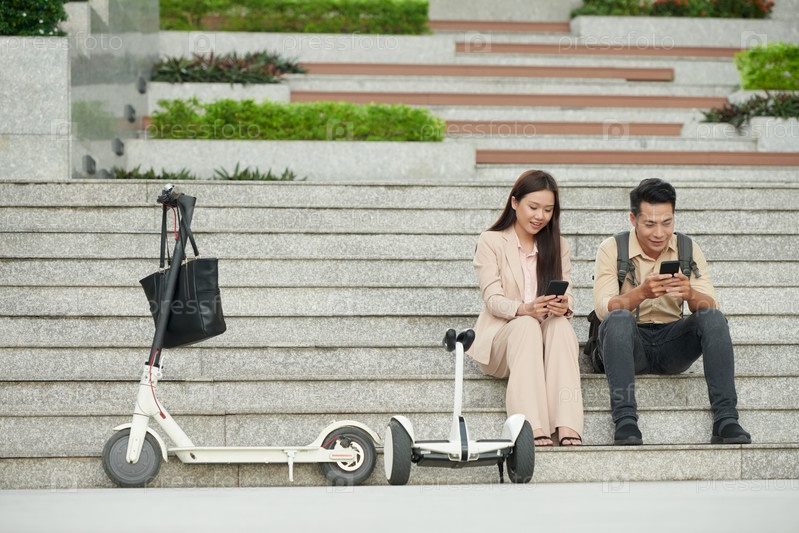 Деловая пара, сидящая на ступеньках