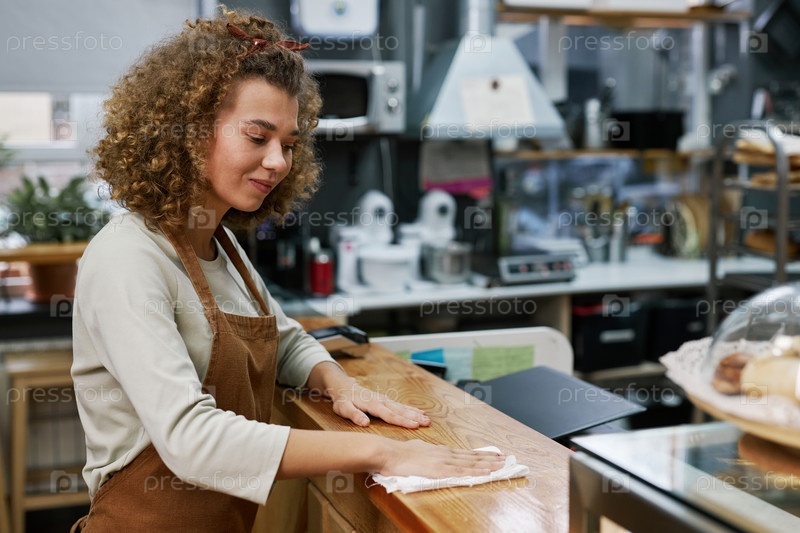 Рабочий в пекарне вытирает столик