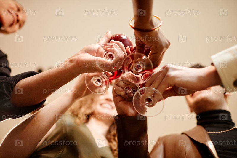 Ниже угол молодых друзей, стучащих со стаканами вина на домашней вечеринке