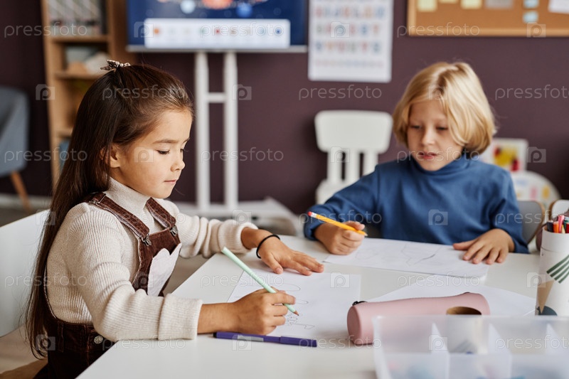 Два усердных школьника рисуют на бумаге карандашами