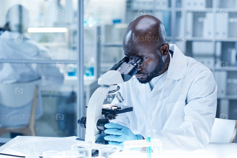 Ученый изучает новый вирус с помощью микроскопа