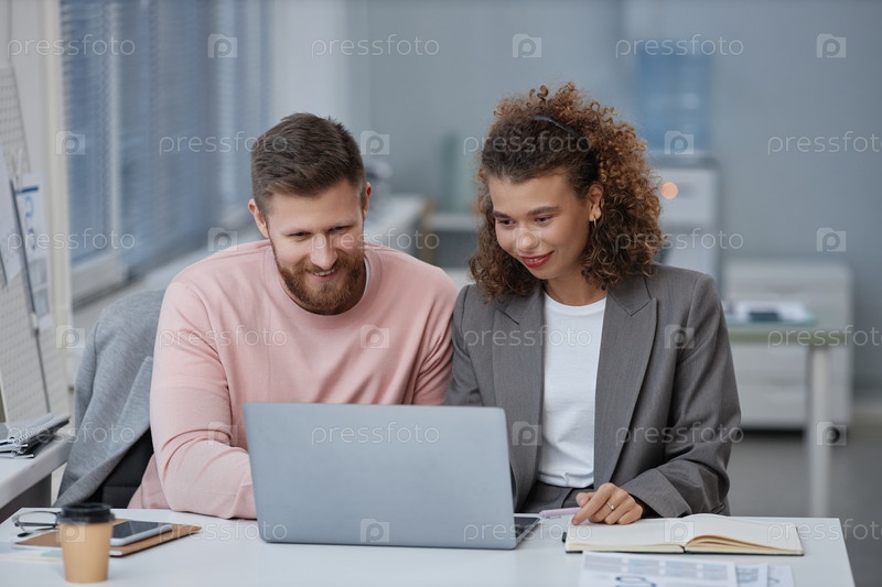 Два молодых экономиста в умной повседневной одежде смотрят на экран ноутбука
