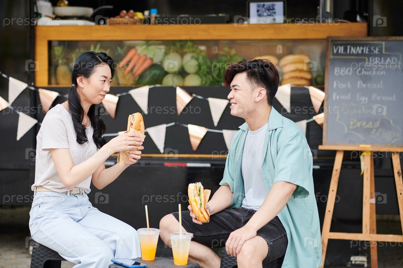 Пара, съедающая уличную еду