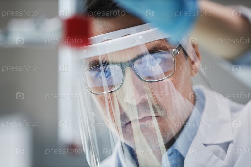 Ученый, носящий щит для лица Мужчина