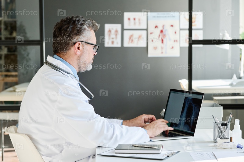 Врач осматривает рентген на ноутбуке в офисе