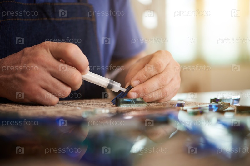 Рабочий использует клей, чтобы сделать ремесло из стекла
