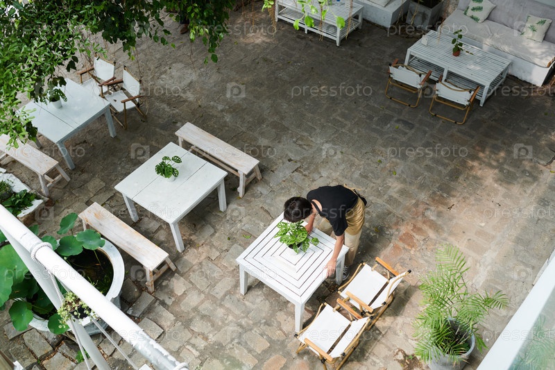 Официант стирает столы