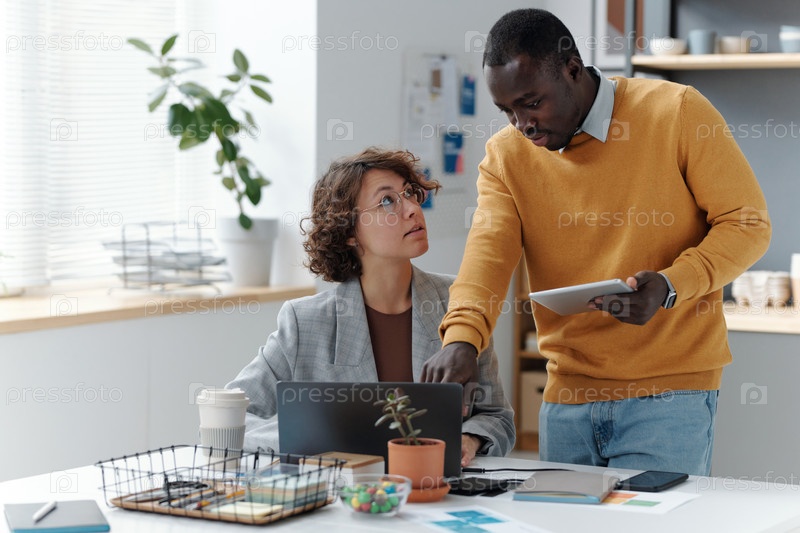 Коллеги обсуждают компьютерную программу на ноутбуке