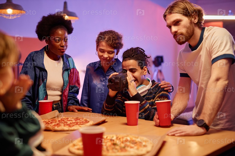 Молодой человек с ретро-видеокамерой снимает друзей, которые едят пиццу на домашней вечеринке