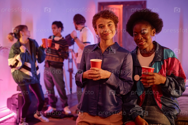 Две девушки на ретро хаус-парти, держащие красные чаши и
