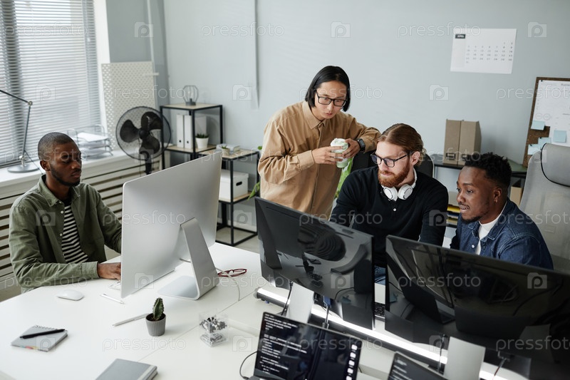 Команда офисных работников в непринужденной одежде смотрит на данные на вычислительном экране rscreen
