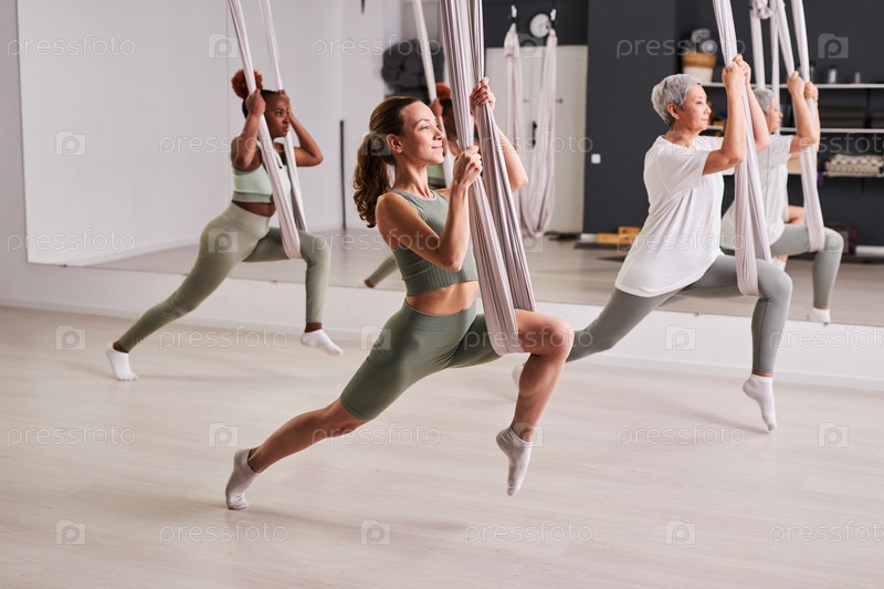 Люди, занимающиеся аэройогой в классе