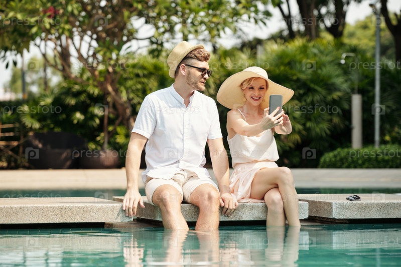 Пара, делающая селфи-портрет у бассейна