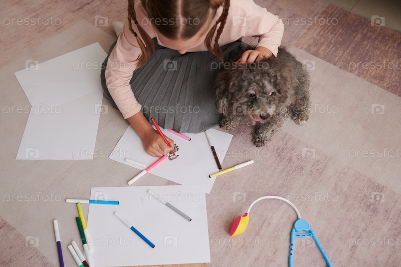 Двенадцатилетняя девочка рисует маленькую собаку Красивая