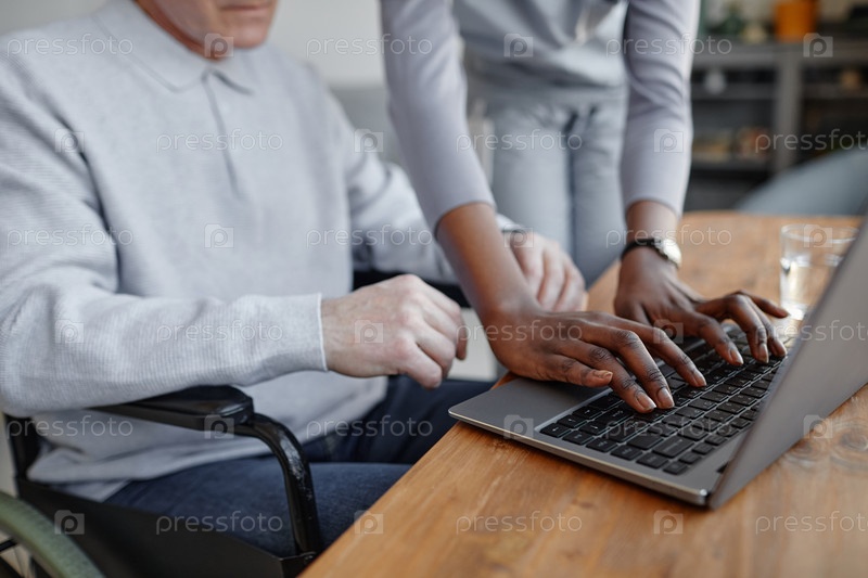Ближайшее изображение чернокожей женщины, помогающей мужчине с инвалидностью с помощью компьютера