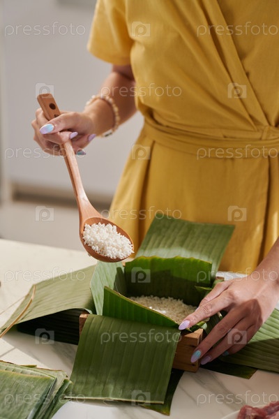 Женщина делает Banh Tet Cake