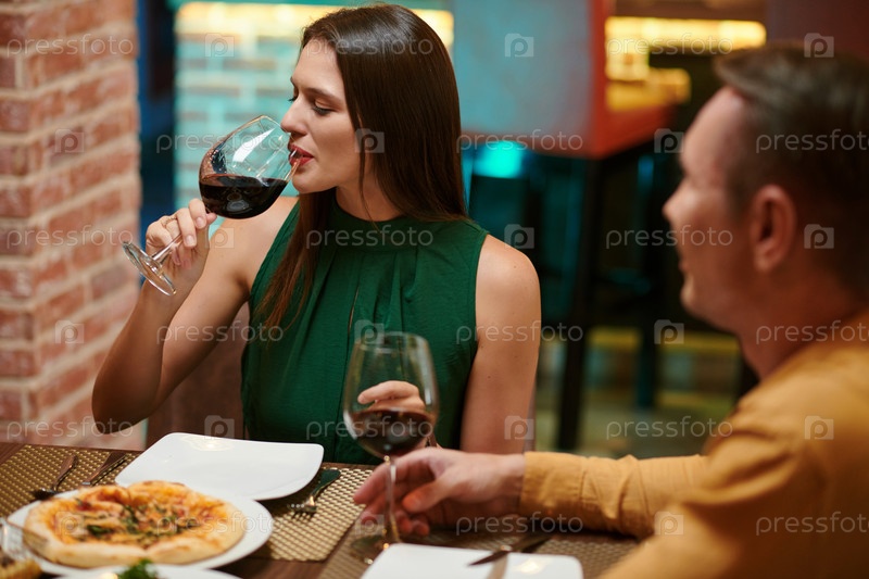 Женщина пьет вино в ресторане