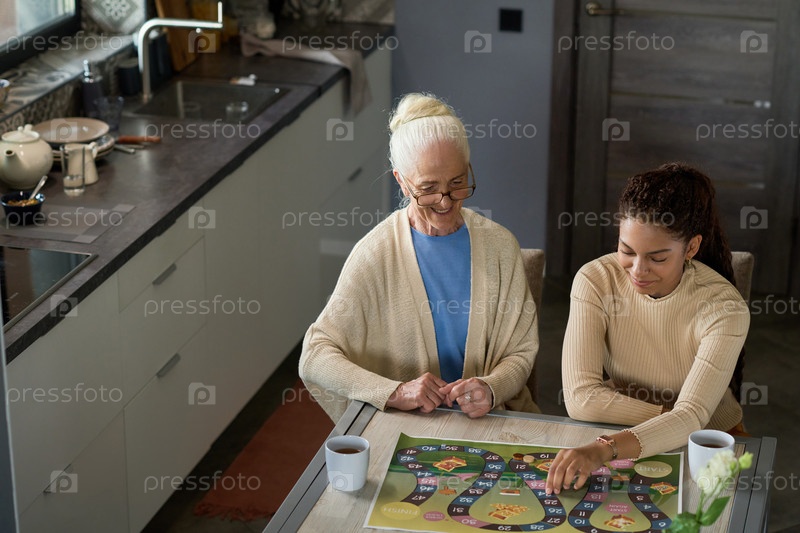 Счастливая бабушка и ее внучка-подросток играют в настольную игру
