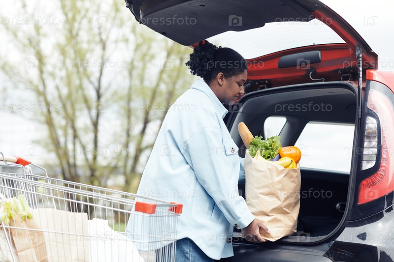 Молодая женщина кладет продукты в машину