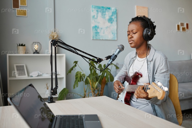 Молодая женщина поет в микрофон