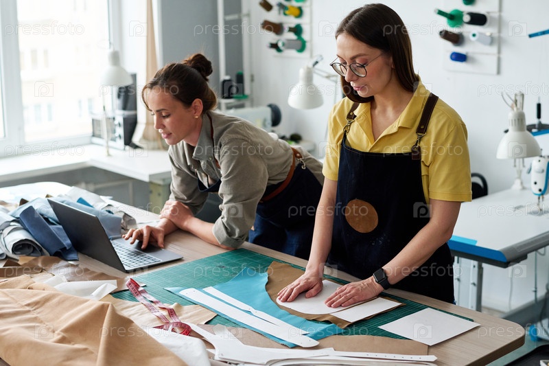 Зрелая женская портная ставит рисунок на кусок кожи против коллеги