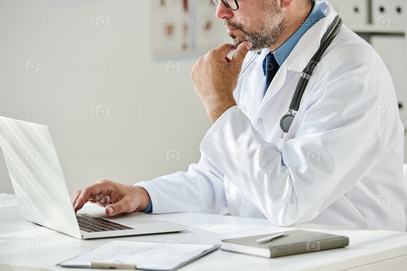 Врач, работающий онлайн на ноутбуке в офисе