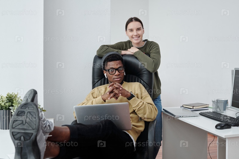 Молодые межкультурные программисты в повседневной одежде смотрят на камеру по рабочему месту