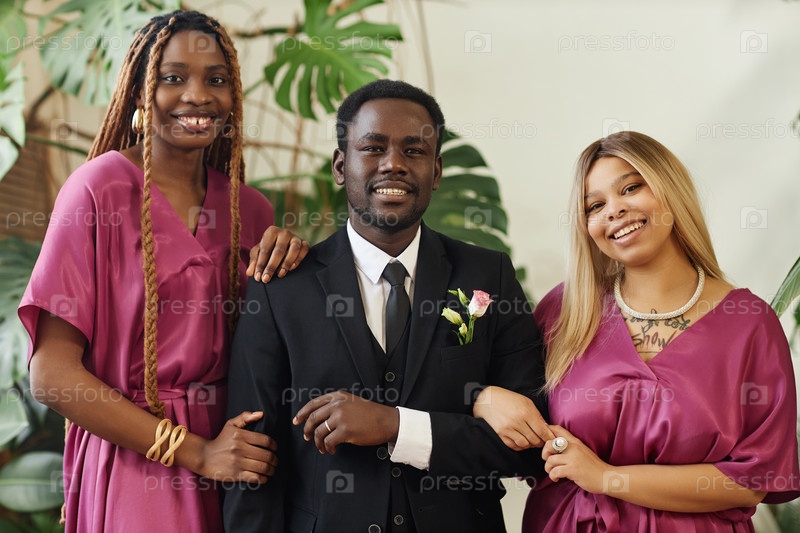 Улыбающийся чернокожий мужчина в роли жениха позирует с подружками невесты и смотрит на камеру