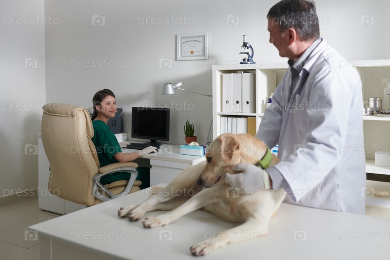 Ветеринар осматривает собаку лабрадор ретривер