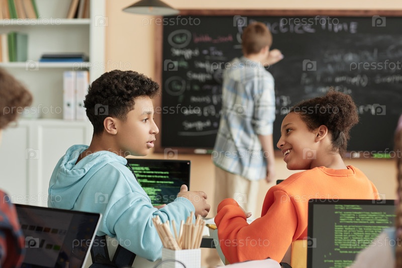 Боковый вид двух подростков, посещающих занятия по программированию для детей