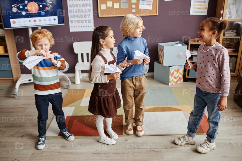 Несколько межкультурных детей в повседневной одежде играют с бумажными самолетами
