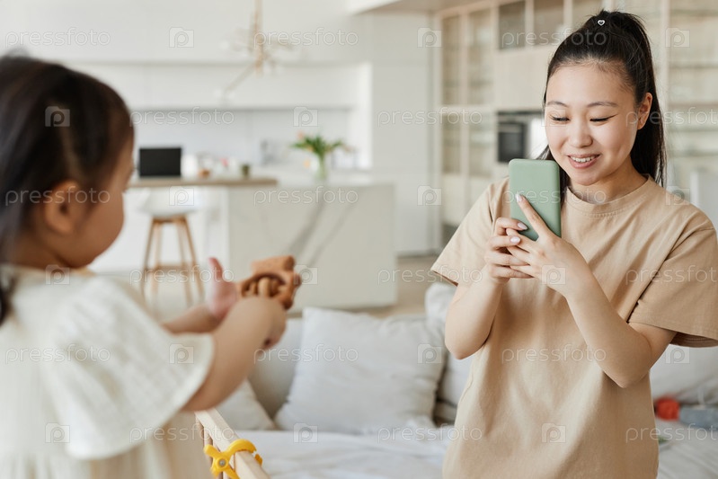 Счастливая мама фотографирует своего ребенка
