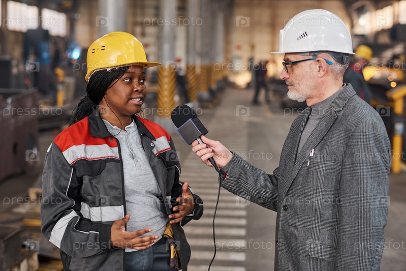 Репортер новостей разговаривает с рабочим на фабрике