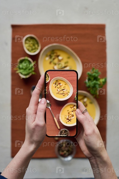 Женщина фотографирует еду по телефону