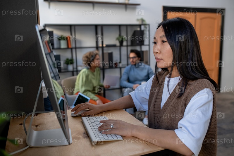 Молодая азиатская бизнесвумен в повседневной одежде, работающая перед компьютерным монитором