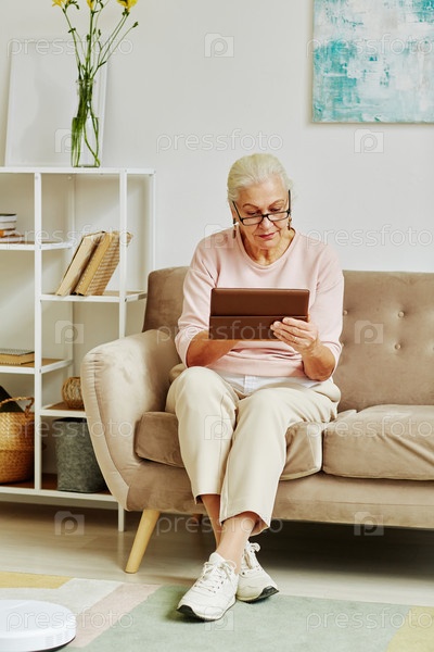 Пожилая женщина, использующая планшет в домашних условиях Полная длина