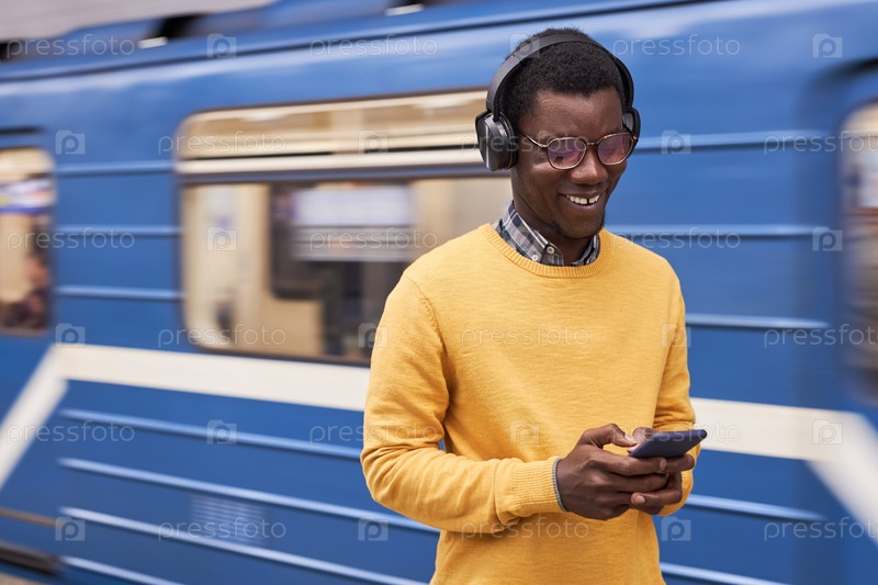 Человек в наушниках, использующий мобильный телефон