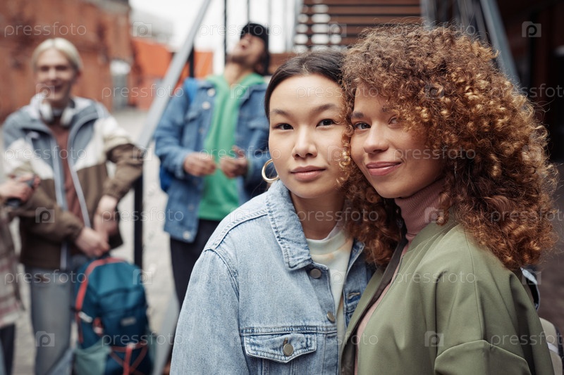 Две счастливые молодые женщины в стильной повседневной одежде смотрят на камеру снаружи