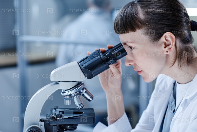 Ученый изучает вирус с помощью микроскопа