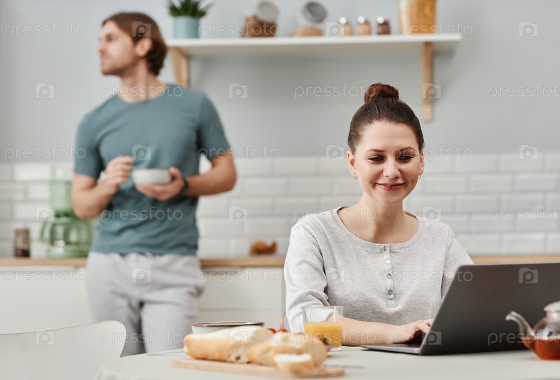 Улыбающаяся молодая женщина использует ноутбук на кухне во время завтрака