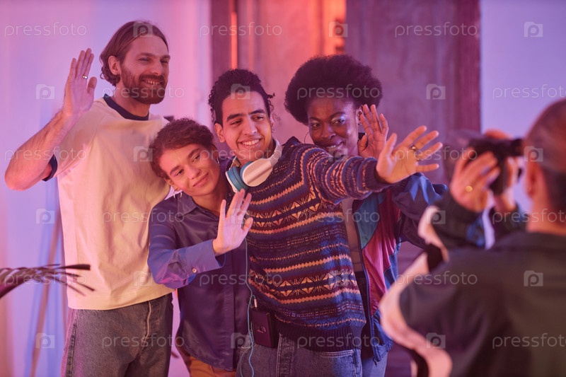 Разнообразная группа друзей развлекается на домашней вечеринке и снимает домашнее видео