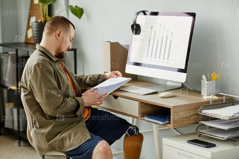 Человек с протезированной ногой работает в домашнем офисе