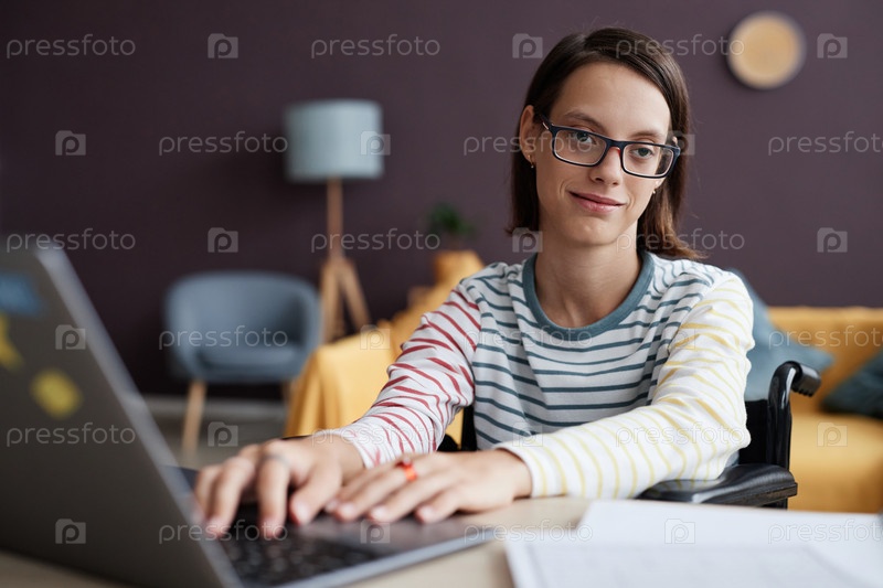 Улыбающаяся девочка-инвалид использует компьютер дома и смотрит на камеру